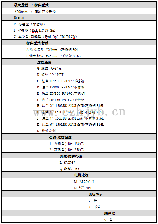 本產(chǎn)品的防爆形式為本質(zhì)安全型。防爆標(biāo)志:Exia IIC T6。本安型導(dǎo)波雷達(dá)物位計采用壓鑄鋁外殼材料,電子部件采用膠封 結(jié)構(gòu),從而確保電路部分故障時產(chǎn)生的火花不會泄放出來。本產(chǎn)品適用于Exia IIC T6 防爆等級以下可燃性介質(zhì)的物位連續(xù)測量。